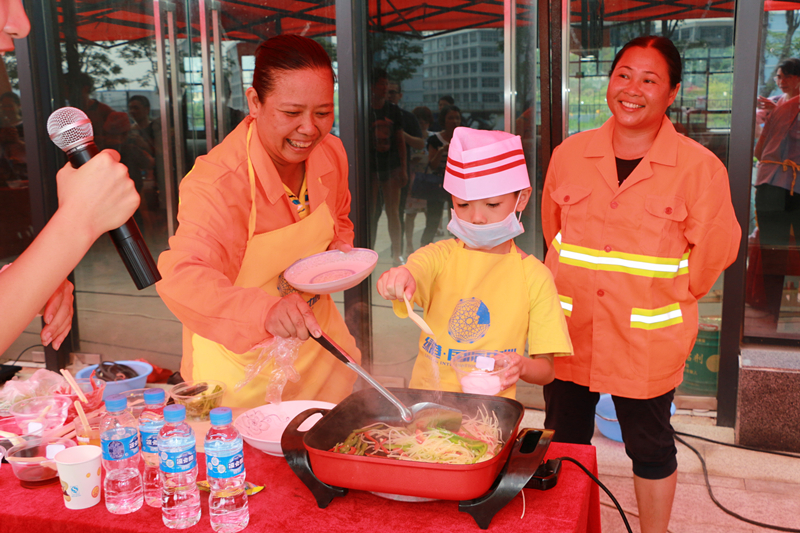 搶答活動(dòng)結(jié)束之后,進(jìn)入“小廚神”廚藝大比拼環(huán)節(jié)。由園林綠化工人、水電維修物業(yè)工人、保潔人員等進(jìn)城務(wù)工人員組成的5組家庭展開了激烈的廚藝大比拼競賽???,小廚神們在父母的指導(dǎo)下井井有條地備菜、炒菜、起鍋,忙得不亦樂乎。各色菜式色香味俱全,充分展現(xiàn)了孩子們“小當(dāng)家”的本領(lǐng)。半小時(shí)后,小廚神們在大家的熱烈掌聲中完成了比賽菜品,廚藝大師及現(xiàn)場觀眾根據(jù)完成的速度、菜品、味道等評出廚藝大賽一等獎(jiǎng)1名,二等獎(jiǎng)2名,三等獎(jiǎng)3名,優(yōu)秀獎(jiǎng)10名。