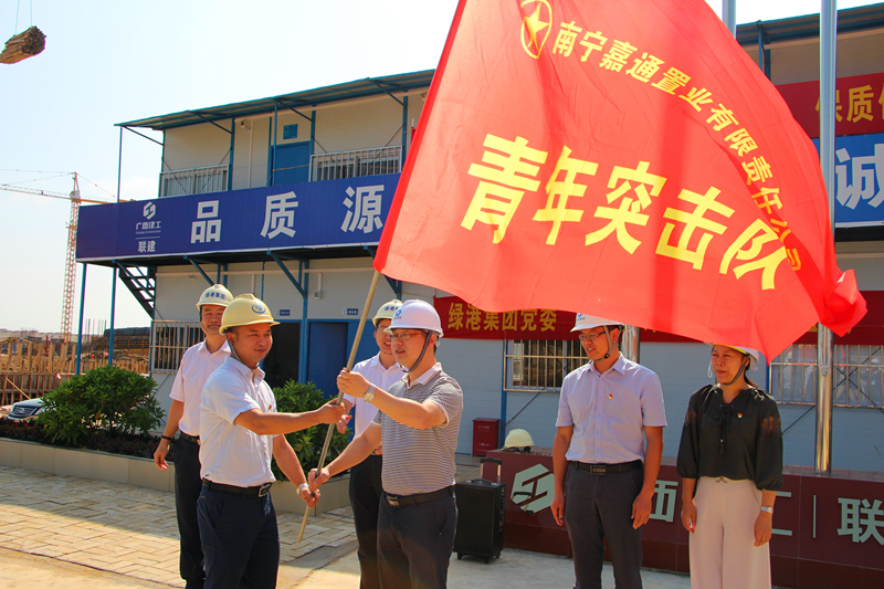 在授旗儀式中,集團(tuán)黨委書記、董事長(zhǎng)、總經(jīng)理龔國(guó)強(qiáng)對(duì)南寧科技產(chǎn)業(yè)園項(xiàng)目人員前期所做出的工作給予了充分肯定,贊揚(yáng)了黨員先鋒隊(duì)員、青年突擊隊(duì)員和工人朋友們?yōu)轫?xiàng)目建設(shè)所付出的艱苦和努力,當(dāng)前項(xiàng)目進(jìn)展取得了較好的成績(jī)。自8月12日南寧科技產(chǎn)業(yè)園項(xiàng)目正式開工以來,嘉通公司黨支部帶領(lǐng)工人們?nèi)找箍喔?,千方百?jì)克服惡劣的臺(tái)風(fēng)天氣等不利因素,在短短的2個(gè)月時(shí)間便完成1#樓廠房一層的搭設(shè)模板,2#、3#樓回填基礎(chǔ)土方,4#樓防水保護(hù)層澆筑以及9#宿舍樓基礎(chǔ)承臺(tái)澆筑等工作,充分展現(xiàn)了綠港鐵軍風(fēng)采。下一步,希望全體黨員先鋒隊(duì)、青年突擊隊(duì)隊(duì)員們以此次授旗為契機(jī),繼續(xù)發(fā)揚(yáng)綠港鐵軍精神,創(chuàng)先爭(zhēng)優(yōu),攻堅(jiān)克難,加快推進(jìn)項(xiàng)目建設(shè),確保項(xiàng)目如期建成交付。
