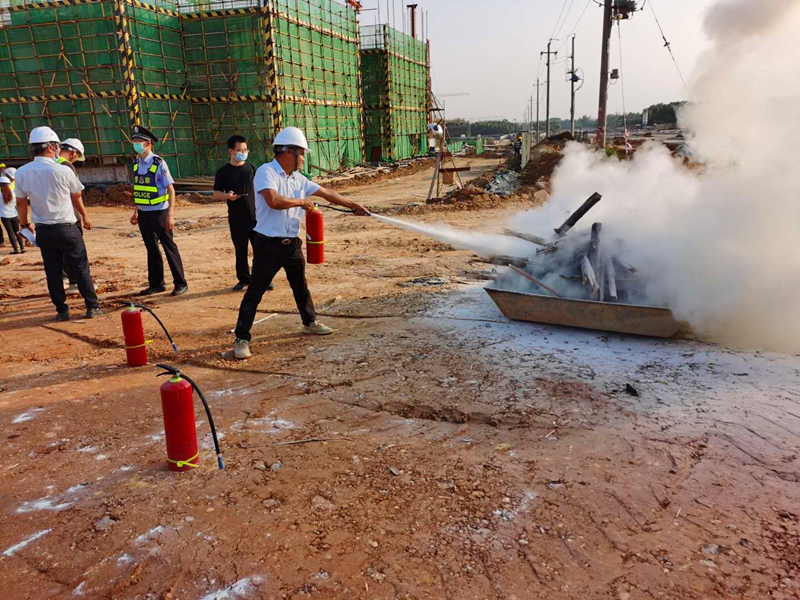 此次活動(dòng)主要是模擬火災(zāi)發(fā)生后的應(yīng)急處置?;顒?dòng)當(dāng)天,發(fā)現(xiàn)險(xiǎn)情后,安全員立即上報(bào),并進(jìn)行控制和處理,并播報(bào)消防疏散通知。在總指揮的安排下,安全防護(hù)組、滅火行動(dòng)組、疏散救援組、通訊聯(lián)絡(luò)組同時(shí)行動(dòng)。安全防護(hù)組立刻關(guān)閉總電源閘門;滅火行動(dòng)組拿取就近的消防器材進(jìn)行滅火;疏散救援組迅速引領(lǐng)工人從安全通道撤離到安全地點(diǎn);通信聯(lián)絡(luò)組將現(xiàn)場情況及時(shí)反饋給總指揮和現(xiàn)場指揮。待火勢完全撲滅,所有人員到達(dá)預(yù)定安全地點(diǎn),通訊聯(lián)絡(luò)組認(rèn)真清點(diǎn)人數(shù),確認(rèn)無任何人員傷亡及財(cái)產(chǎn)損失。演練結(jié)束后,項(xiàng)目部組織滅火器的實(shí)操練習(xí)。施工人員按照講解的動(dòng)作要領(lǐng)使用了滅火器,對布置的“起火點(diǎn)”進(jìn)行有效撲救。